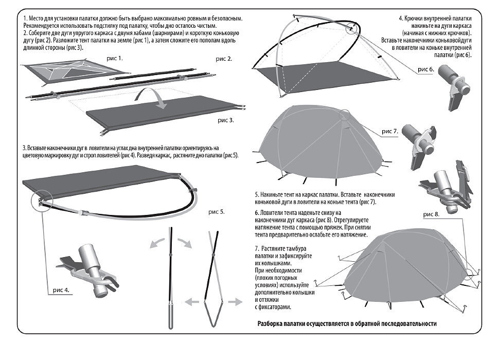 При сборке дуг обратите внимание на сочленения трубок – между элементами не должно оставаться зазоров. Избегайте попадания грязи и песка на соединительные элементы каркаса. Каркас должен собираться свободно без значительных усилий. Разборку дуг следует начинать с середины и далее складывать попарно. Во-первых, это продлит срок службы внутренней резинки за счет равномерного ее растяжения. Во-вторых, это просто-напросто позволит Вам облегчить разборку: быстрее и требует гораздо меньше пространства. Каким бы прочным каркас не был, но выше предусмотренных конструкцией палатки нагрузок он не выдержит. Не надо подтягиваться на дугах каркаса, чтобы проверить его прочность. Упавшее дерево каркас тоже не выдержат. Храните дуги упакованными, в сухом месте.