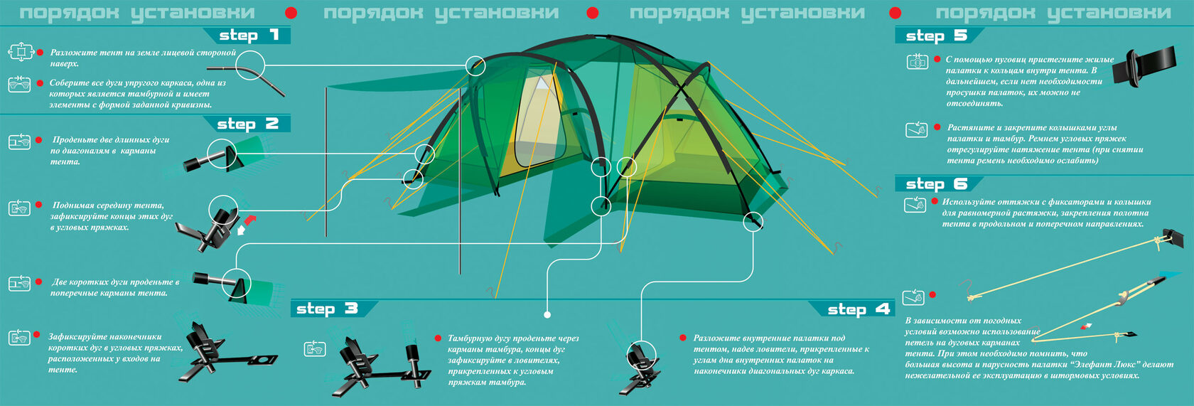 При сборке дуг обратите внимание на сочленения трубок – между элементами не должно оставаться зазоров. Избегайте попадания грязи и песка на соединительные элементы каркаса. Каркас должен собираться свободно без значительных усилий. Разборку дуг следует начинать с середины и далее складывать попарно. Во-первых, это продлит срок службы внутренней резинки за счет равномерного ее растяжения. Во-вторых, это просто-напросто позволит Вам облегчить разборку: быстрее и требует гораздо меньше пространства. Каким бы прочным каркас не был, но выше предусмотренных конструкцией палатки нагрузок он не выдержит. Не надо подтягиваться на дугах каркаса, чтобы проверить его прочность. Упавшее дерево каркас тоже не выдержат. Храните дуги упакованными, в сухом месте.