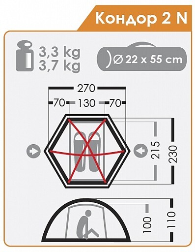 Конструкция: Двухслойная трёхдуговая полусфера с независимой внутренней палаткой.