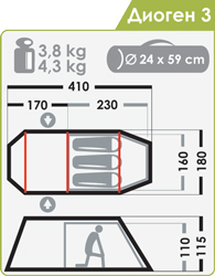 Конструкция: Двухслойная трёхдуговая полубочка с подвесной внутренней палаткой и большим тамбуром.