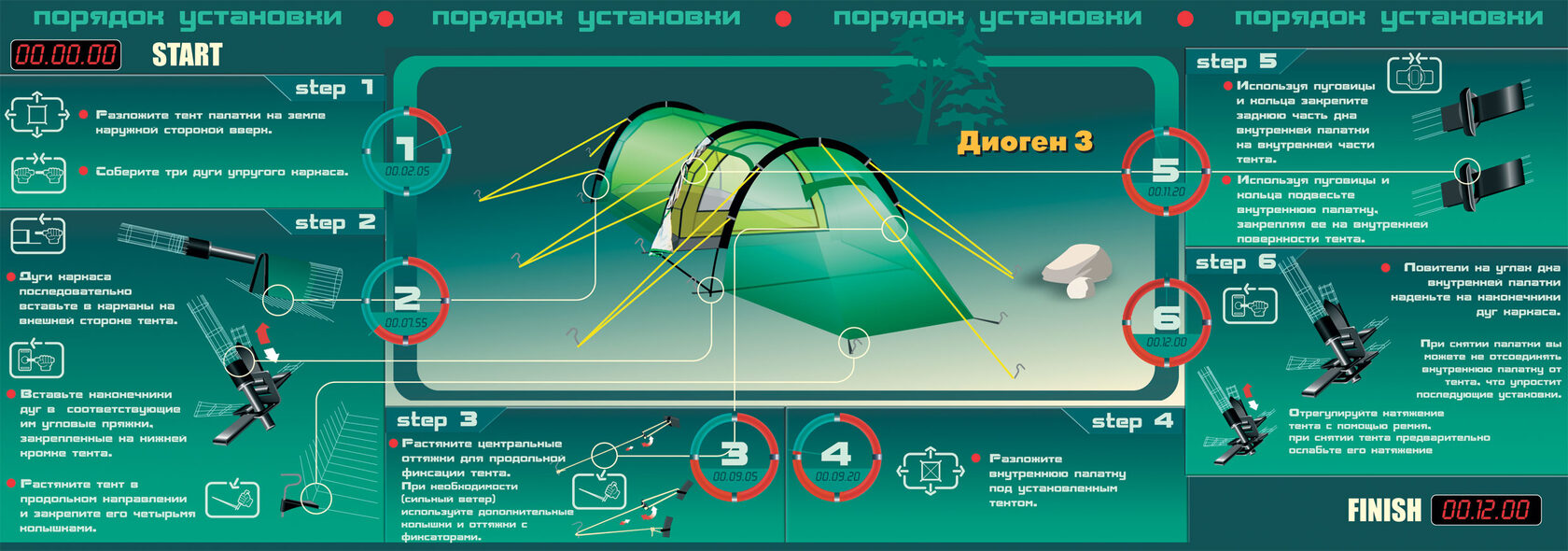 При сборке дуг обратите внимание на сочленения трубок – между элементами не должно оставаться зазоров. Избегайте попадания грязи и песка на соединительные элементы каркаса. Каркас должен собираться свободно без значительных усилий. Разборку дуг следует начинать с середины и далее складывать попарно. Во-первых, это продлит срок службы внутренней резинки за счет равномерного ее растяжения. Во-вторых, это просто-напросто позволит Вам облегчить разборку: быстрее и требует гораздо меньше пространства. Каким бы прочным каркас не был, но выше предусмотренных конструкцией палатки нагрузок он не выдержит. Не надо подтягиваться на дугах каркаса, чтобы проверить его прочность. Упавшее дерево каркас тоже не выдержат. Храните дуги упакованными, в сухом месте.
