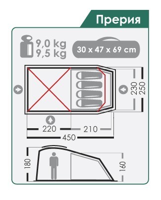 Габаритные размеры тента (l x b x h), см: 250x450x180