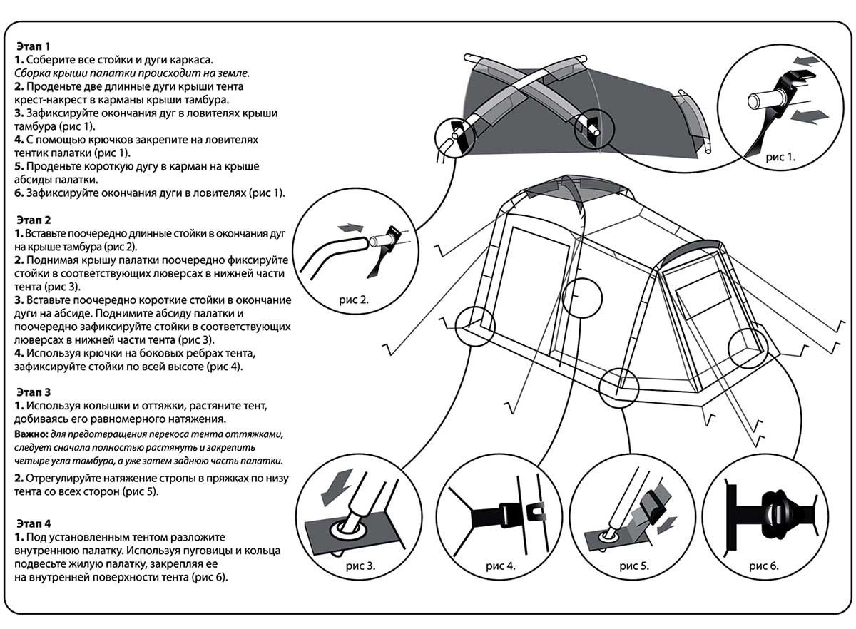 При сборке дуг обратите внимание на сочленения трубок – между элементами не должно оставаться зазоров. Избегайте попадания грязи и песка на соединительные элементы каркаса. Каркас должен собираться свободно без значительных усилий. Разборку дуг следует начинать с середины и далее складывать попарно. Во-первых, это продлит срок службы внутренней резинки за счет равномерного ее растяжения. Во-вторых, это просто-напросто позволит Вам облегчить разборку: быстрее и требует гораздо меньше пространства. Каким бы прочным каркас не был, но выше предусмотренных конструкцией палатки нагрузок он не выдержит. Не надо подтягиваться на дугах каркаса, чтобы проверить его прочность. Упавшее дерево каркас тоже не выдержат. Храните дуги упакованными, в сухом месте.