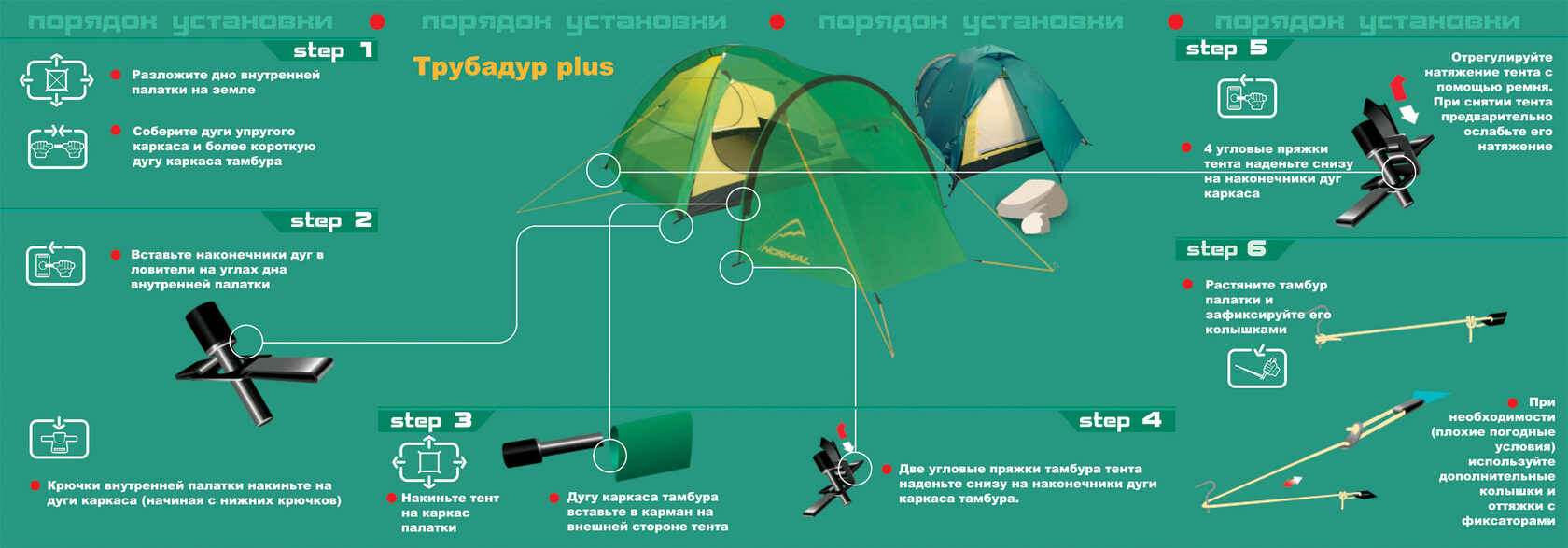 Палатки Normal изготовлены из легких, прочных и водонепроницаемых материалов, однако и они требуют правильной эксплуатации и хранения.