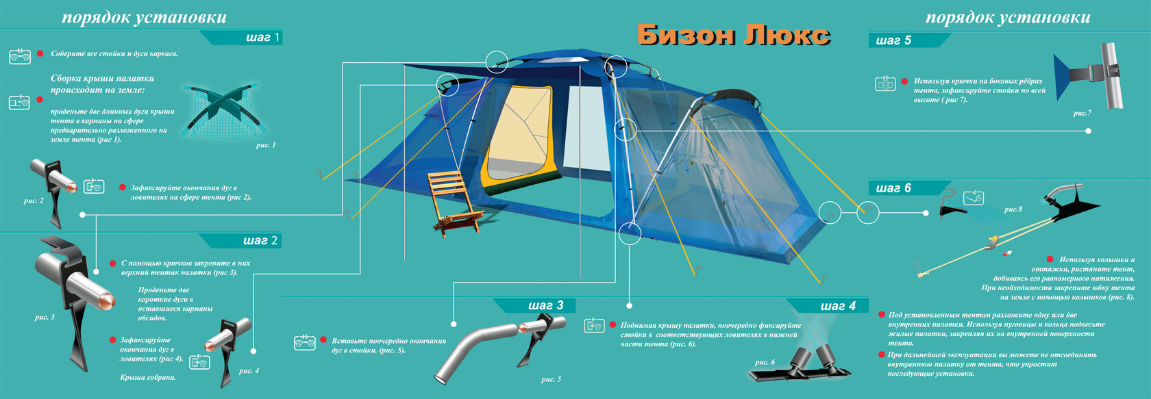При сборке дуг обратите внимание на сочленения трубок – между элементами не должно оставаться зазоров. Избегайте попадания грязи и песка на соединительные элементы каркаса. Каркас должен собираться свободно без значительных усилий. Разборку дуг следует начинать с середины и далее складывать попарно. Во-первых, это продлит срок службы внутренней резинки за счет равномерного ее растяжения. Во-вторых, это просто-напросто позволит Вам облегчить разборку: быстрее и требует гораздо меньше пространства. Каким бы прочным каркас не был, но выше предусмотренных конструкцией палатки нагрузок он не выдержит. Не надо подтягиваться на дугах каркаса, чтобы проверить его прочность. Упавшее дерево каркас тоже не выдержат. Храните дуги упакованными, в сухом месте.