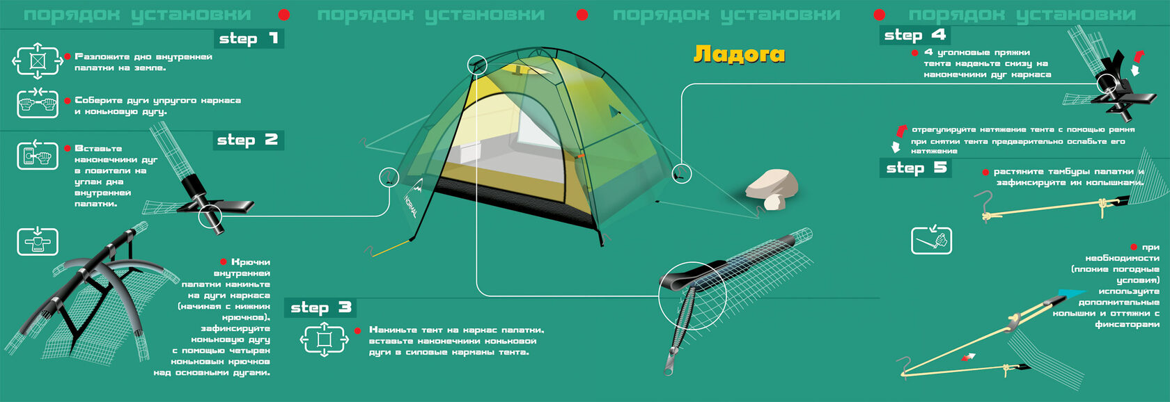 При сборке дуг обратите внимание на сочленения трубок – между элементами не должно оставаться зазоров. Избегайте попадания грязи и песка на соединительные элементы каркаса. Каркас должен собираться свободно без значительных усилий. Разборку дуг следует начинать с середины и далее складывать попарно. Во-первых, это продлит срок службы внутренней резинки за счет равномерного ее растяжения. Во-вторых, это просто-напросто позволит Вам облегчить разборку: быстрее и требует гораздо меньше пространства. Каким бы прочным каркас не был, но выше предусмотренных конструкцией палатки нагрузок он не выдержит. Не надо подтягиваться на дугах каркаса, чтобы проверить его прочность. Упавшее дерево каркас тоже не выдержат. Храните дуги упакованными, в сухом месте.