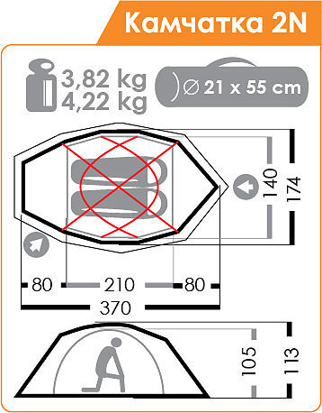 Конструкция: Палатка представляет собой двухслойную конструкцию со сборным каркасом и подвесной внутренней палаткой.