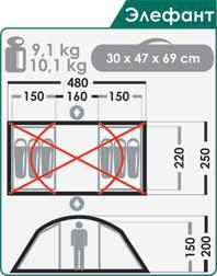 Конструкция: Двухслойный четырёхдуговой шатёр с двумя подвесными внутренними палатками.
