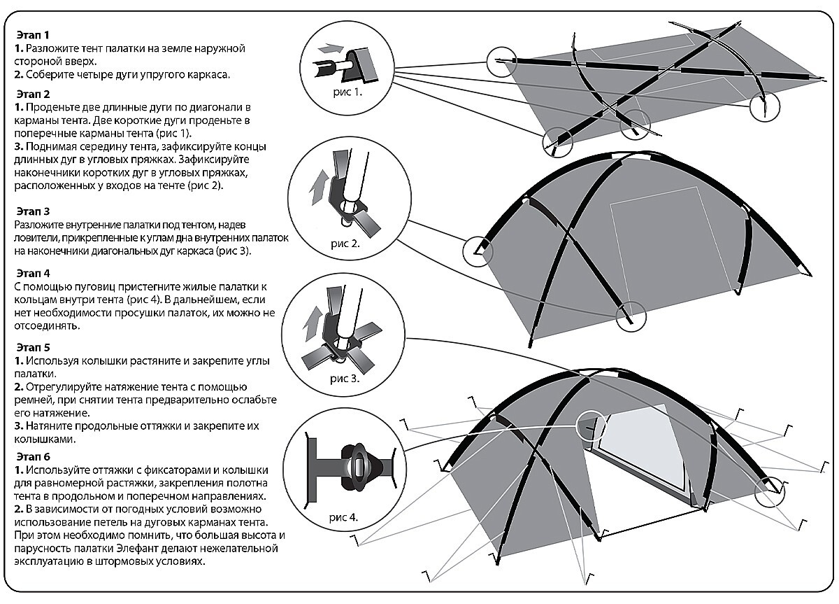 При сборке дуг обратите внимание на сочленения трубок – между элементами не должно оставаться зазоров. Избегайте попадания грязи и песка на соединительные элементы каркаса. Каркас должен собираться свободно без значительных усилий. Разборку дуг следует начинать с середины и далее складывать попарно. Во-первых, это продлит срок службы внутренней резинки за счет равномерного ее растяжения. Во-вторых, это просто-напросто позволит Вам облегчить разборку: быстрее и требует гораздо меньше пространства. Каким бы прочным каркас не был, но выше предусмотренных конструкцией палатки нагрузок он не выдержит. Не надо подтягиваться на дугах каркаса, чтобы проверить его прочность. Упавшее дерево каркас тоже не выдержат. Храните дуги упакованными, в сухом месте.
