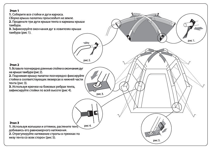 При сборке дуг обратите внимание на сочленения трубок – между элементами не должно оставаться зазоров. Избегайте попадания грязи и песка на соединительные элементы каркаса. Каркас должен собираться свободно без значительных усилий. Разборку дуг следует начинать с середины и далее складывать попарно. Во-первых, это продлит срок службы внутренней резинки за счет равномерного ее растяжения. Во-вторых, это просто-напросто позволит Вам облегчить разборку: быстрее и требует гораздо меньше пространства. Каким бы прочным каркас не был, но выше предусмотренных конструкцией палатки нагрузок он не выдержит. Не надо подтягиваться на дугах каркаса, чтобы проверить его прочность. Упавшее дерево каркас тоже не выдержат. Храните дуги упакованными, в сухом месте.