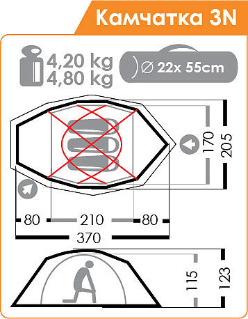 Габаритные размеры внутренней палатки (l: 210 х 170 х 115