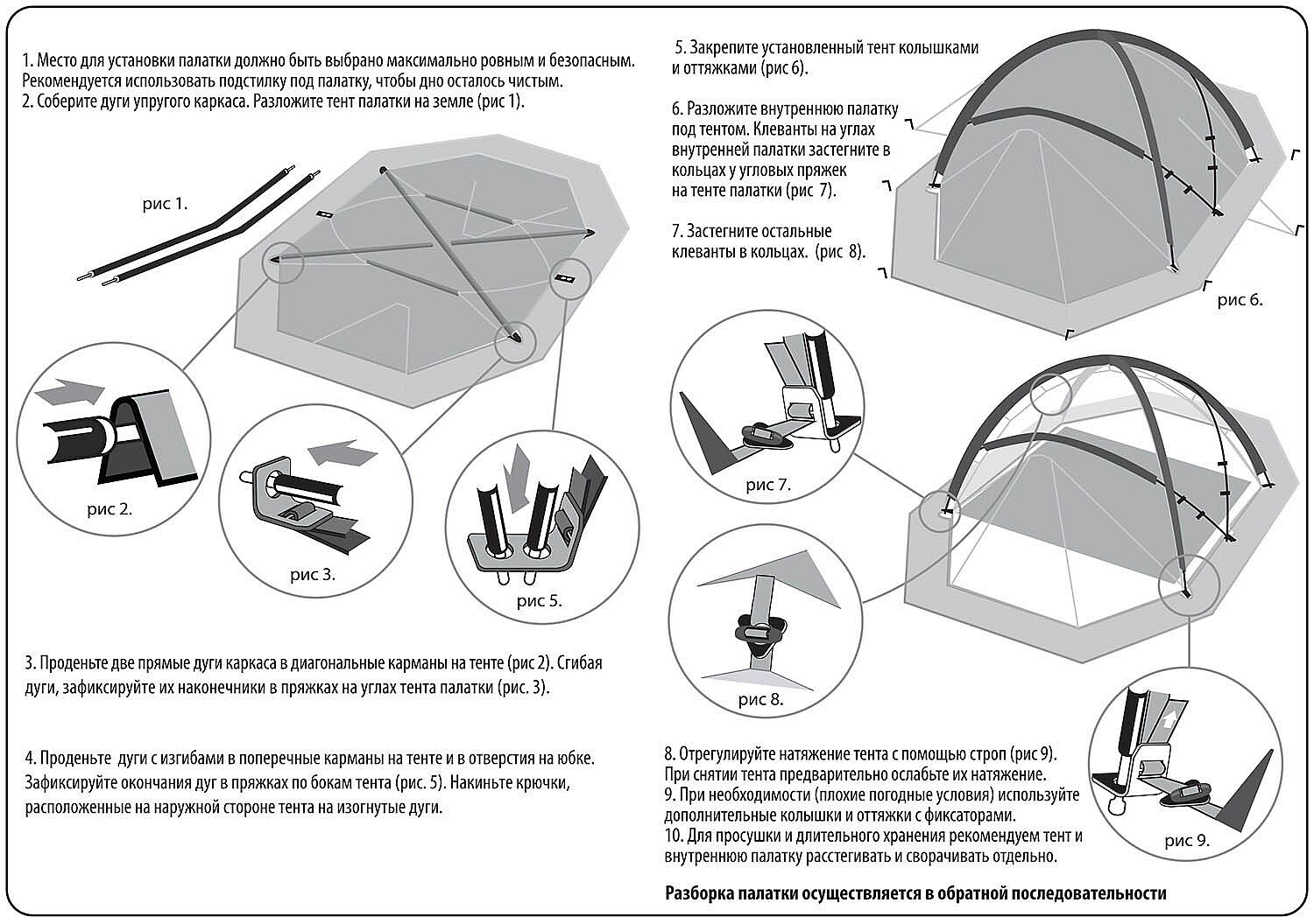 При сборке дуг обратите внимание на сочленения трубок – между элементами не должно оставаться зазоров. Избегайте попадания грязи и песка на соединительные элементы каркаса. Каркас должен собираться свободно без значительных усилий. Разборку дуг следует начинать с середины и далее складывать попарно. Во-первых, это продлит срок службы внутренней резинки за счет равномерного ее растяжения. Во-вторых, это просто-напросто позволит Вам облегчить разборку: быстрее и требует гораздо меньше пространства. Каким бы прочным каркас не был, но выше предусмотренных конструкцией палатки нагрузок он не выдержит. Не надо подтягиваться на дугах каркаса, чтобы проверить его прочность. Упавшее дерево каркас тоже не выдержат. Храните дуги упакованными, в сухом месте.