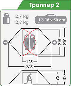 Траппер 2 — вариант палатки из обычных тканей. Обладает всеми достоинствами компоновки с внешними дугами и значительно меньшей ценой (при несколько большем весе).